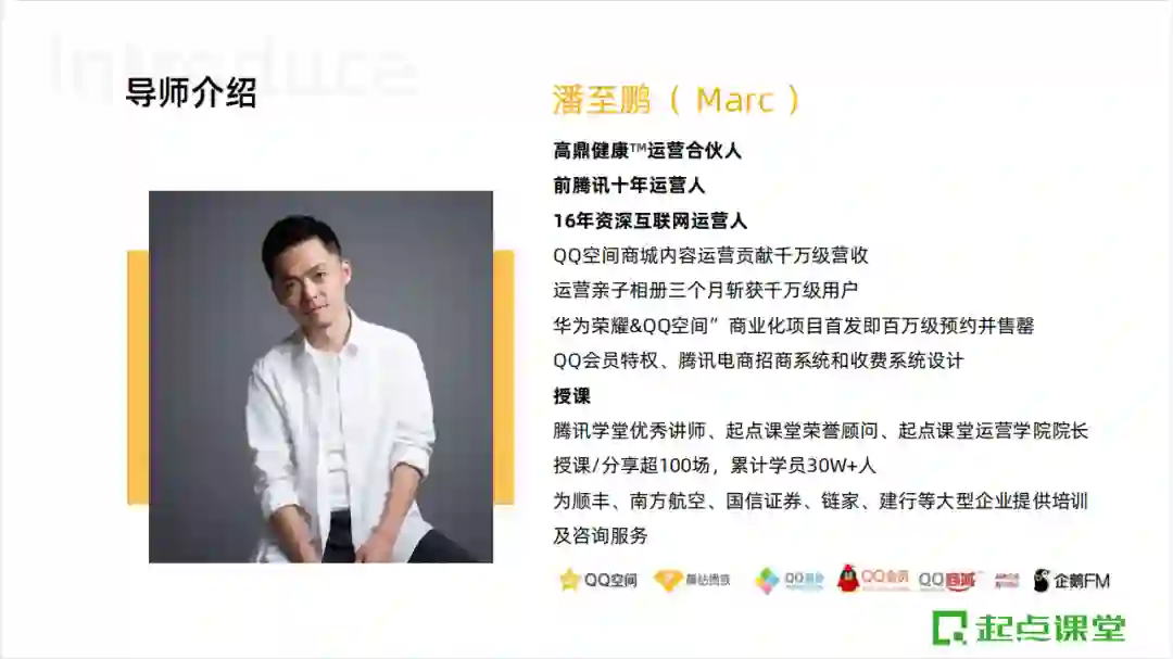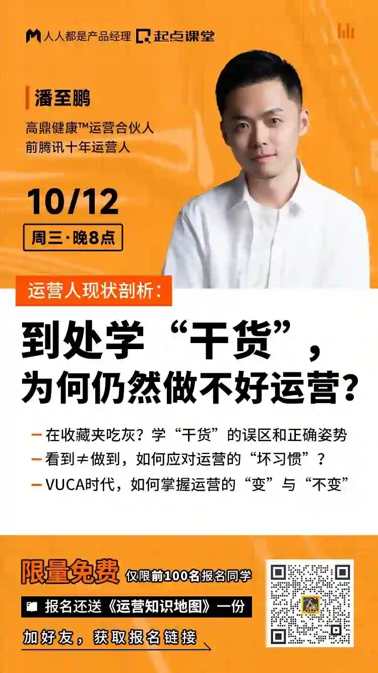 由人人都是产品经理&起点课堂出品,专为0-2年运营从业、想转岗运营的职场人、想入职运营的大学生量身打造的体验课,由前腾讯高级运营经理、起点课堂运营学院院长@潘至鹏老师主讲。