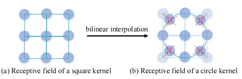 在构造圆形卷积核时,由于感受野上的一些点通常不在网格上,因此作者采用双线性插值进行逼近,并提取了相应的变换矩阵。