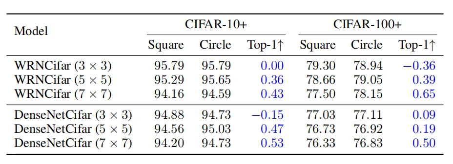 如上表所示,作者在WRNCifar和DenseNetCifar上做了实验。随着卷积核大小的增加,圆核比方核的优势变得更加显著,表明了圆核的优越性。