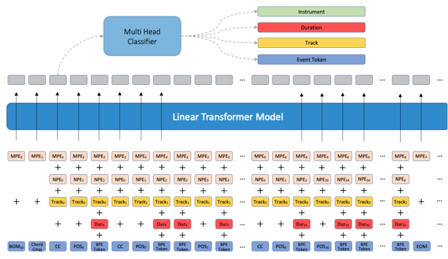 基于多轨道音乐的特点,本文设计了一种基于线性自注意力的纯解码器结构,由于音乐序列的多维特性,本文为音乐事件的四个属性设计了不同的前馈输出头,这些属性是乐器,轨道,音符时长和事件符号。