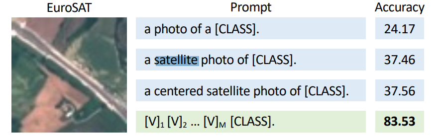 当然,在深度学习领域,这种「咒语」有个统一的名字——「prompt」。prompt 和 prompt 工程是近年来非常火的话题,它可以帮助我们控制模型的预测输出。合适的 prompt 对于模型的效果至关重要,大量研究表明,prompt 的微小差别,可能会造成效果的巨大差异 [1]。比如在下面这个卫星图片识别的例子中,我们仅添加一个「 satellite(卫星)」,就能把模型的准确率提升 13%+。