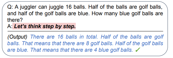 怎么能让 GPT-3 稍微「动动脑子」呢?想想我们上学的时候老师是怎么做的。一般来说,优秀的老师会在我们做错题时鼓励我们「再回去想想」,或者帮我们理清解题步骤。同样的,我们也可以这么对 GPT-3。东京大学和谷歌大脑的一项联合研究表明,只要在答案前加一句「 Let’s think step by step 」,GPT-3 就能给出上述问题的正确答案,而且它还自己理清了解题步骤。