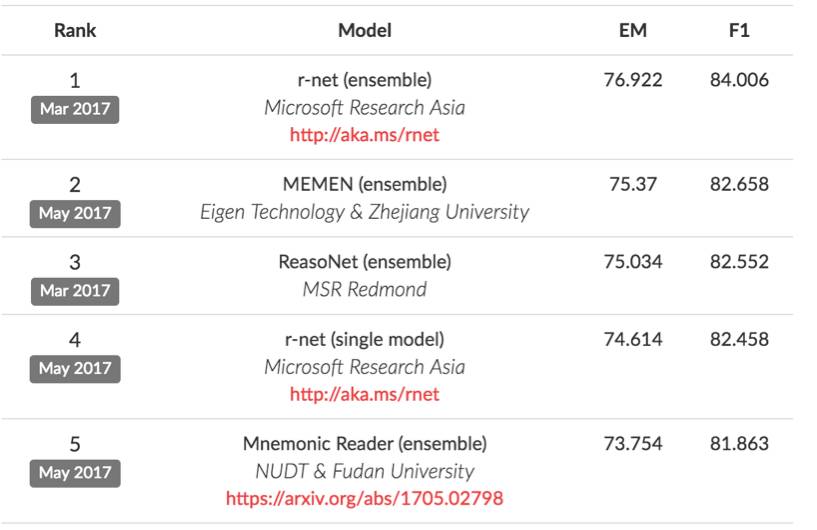 该数据集一经推出便引发学术界的持续关注,在SQuAD的Leadeboard上不断有新的模型提出一遍遍刷新benchmark,截止目前(2017年6月),最好的方法已经获得超过84的F1值。值得一提的是,Standford在推出该数据集时,基于传统Lexical特征工程的方式构造了Baseline(考虑Word/POS/Dependency..),作为白盒模型有较好的比较意义,同时也提供了人工评测的Acc作参照,方便衡量问题上界。