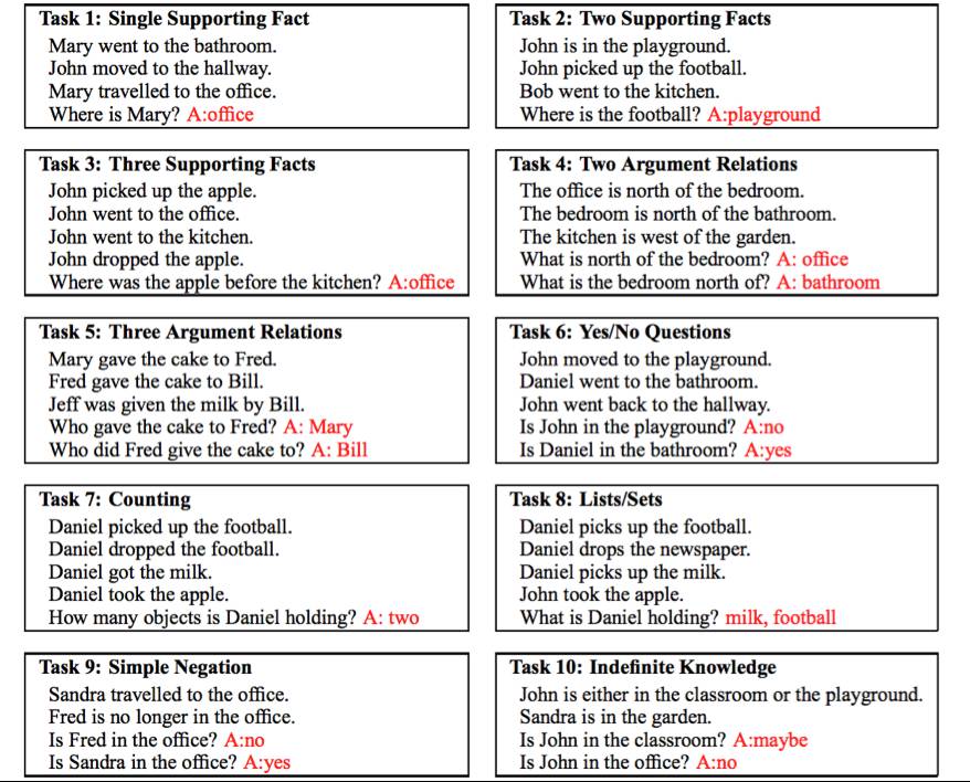 [1]Weston et al. 2015. Towards AI-Complete Question Answering: A Set ofPrerequisite Toy Tasks