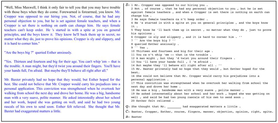 该数据集也是由真实的儿童读物,由自动标注方式构成,其形式是给出21个句子,前20个是完整的供机器阅读的句子,将第21个句子中的实体抽掉,要求能正确预测出来。