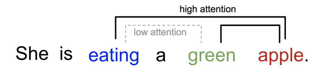类似的,我们同样可以解释,一个句子或近似语境中单词之间的关系。在一句话中,当我们看到“吃”这个单词的时候,我们很快就会遇到一个食物词(apple)。虽然颜色术语(green)描述了食物,但可能跟“吃”之间没有直接的关系。