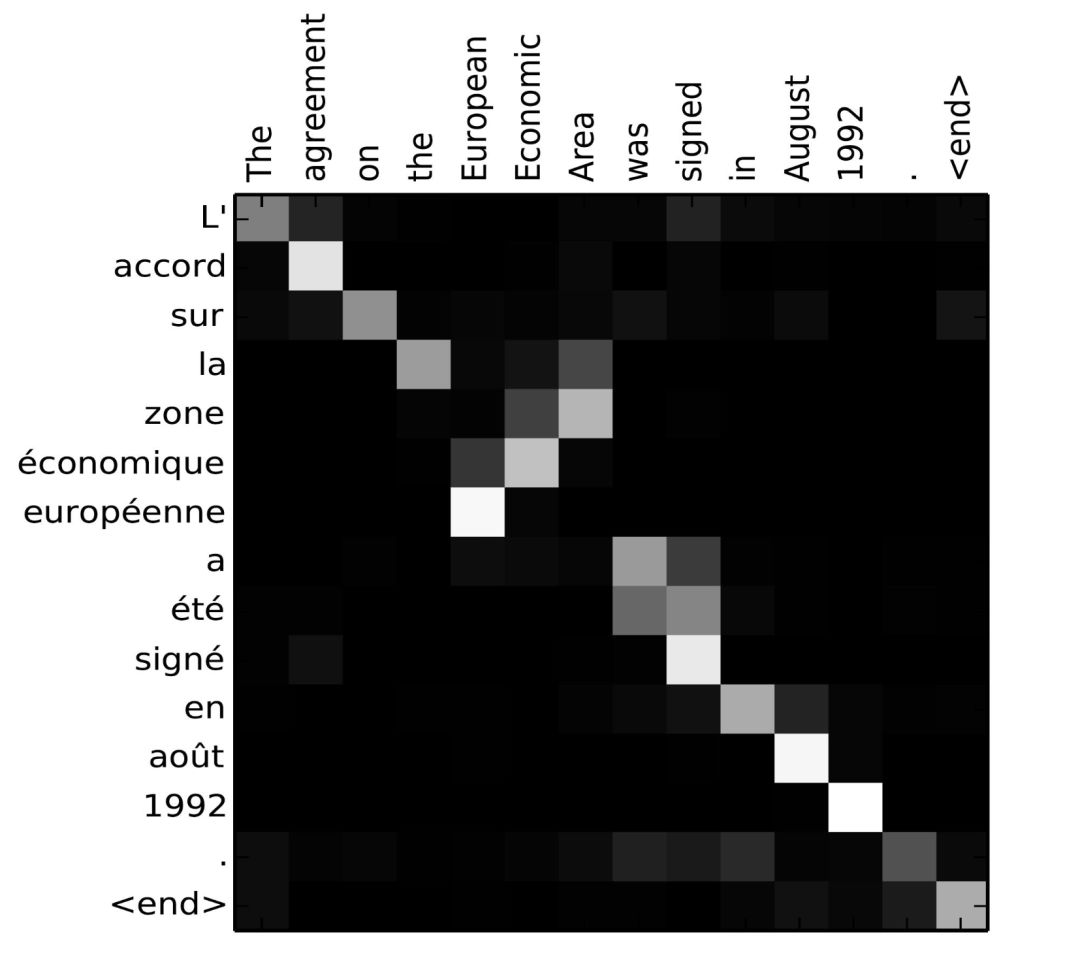 对齐分数矩阵是一个很好的副产品,它可以很好的显示出源单词和目标单词之间的相关性。