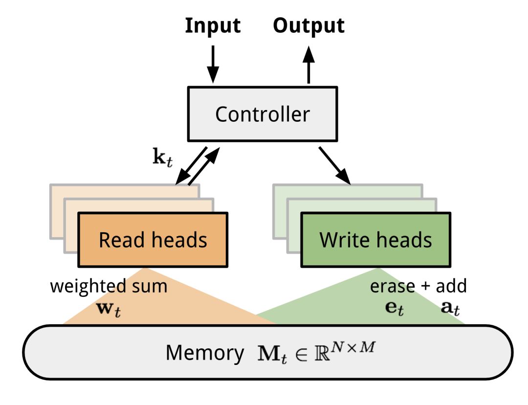 神经图灵机(NTM,Graves, Wayne & Danihelka, 2014)是一种神经网络与外部存储器耦合的模型结构。存储器模仿图灵机磁带,神经网络控制操作头从磁带读取或者向磁带中写。然而,NTM中的内存是有限的,因此它看起来更像是一台“神经冯诺伊曼机器”。