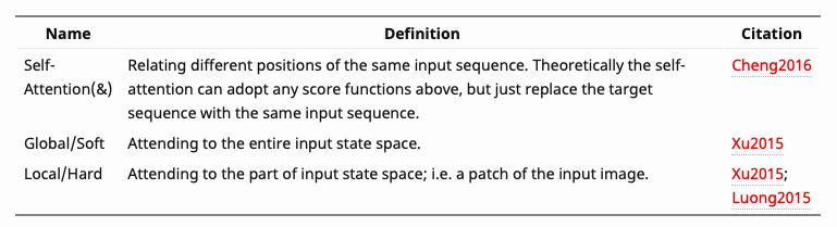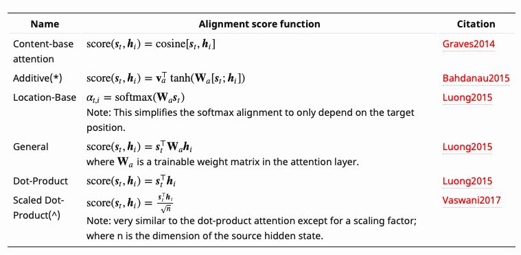 下面的表格,我们总结了几种流行的注意力机制以及相应的对齐分数函数: