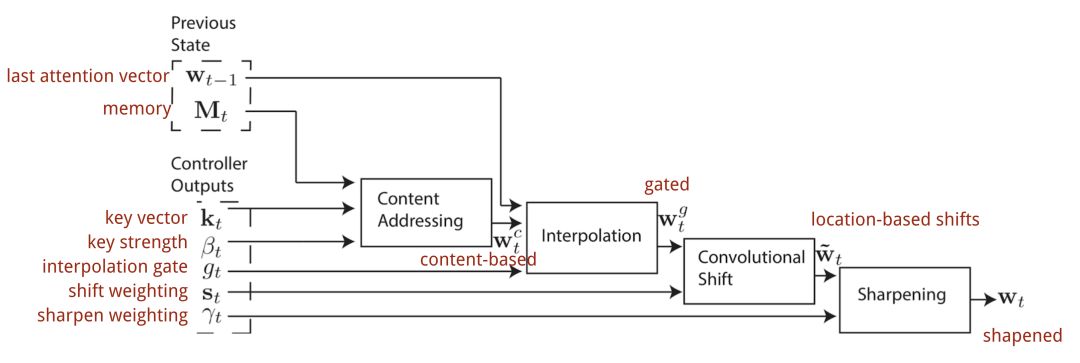 在神经图灵机中,如何产生注意力分布wt取决于寻址机制:神经图灵机使用基于内容和基于位置的寻址的混合寻址方式。