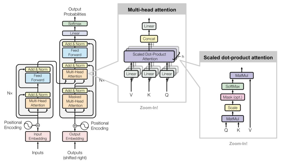 Transformer的主要部件是一个叫做“多头自注意力机制”的单元(multi-head self-attention mechanism)。Transformer将输入的编码表示形式视为一组键key-值value对(K,V),它们的维度都是n(输入序列长度);在NMT的上下文中,key和value都是编码器的隐含层状态。在解码器中,上一步的输出被压缩为一个查询query(Q的维度为m),下一步的输出是通过映射这个查询query到一组键key和值value的集合生成的。Attention 函数的本质可以被描述为一个查询到一系列键-值对的映射。