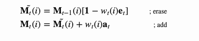 在t时刻写入内存时,受LSTM中输入和遗忘门的启发,写入磁头首先根据一个擦除向量擦除一些旧的内容,然后通过一个加法向量