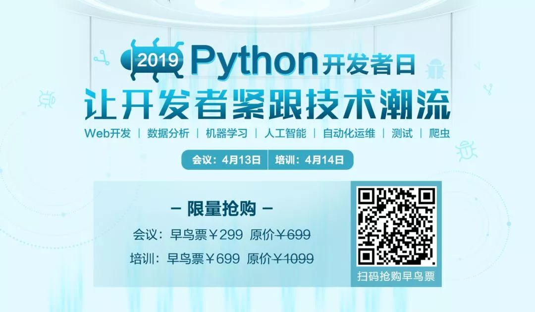 4月13-14日,CSDN将在北京主办“Python开发者日(2019)”,汇聚十余位来自阿里巴巴、IBM、英伟达等国内外一线科技公司的Python技术专家,还有数百位来自各行业领域的Python开发者,共同探讨Python在不同场景下的的应用优势和实战经验。即刻扫码抢购早鸟票,限量发售!