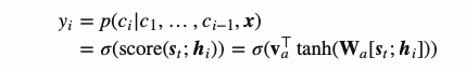 。指针网络使用addictive attention作为对分数齐函数,然后同样使用softmax进行归一化从而建立输出条件概率模型: