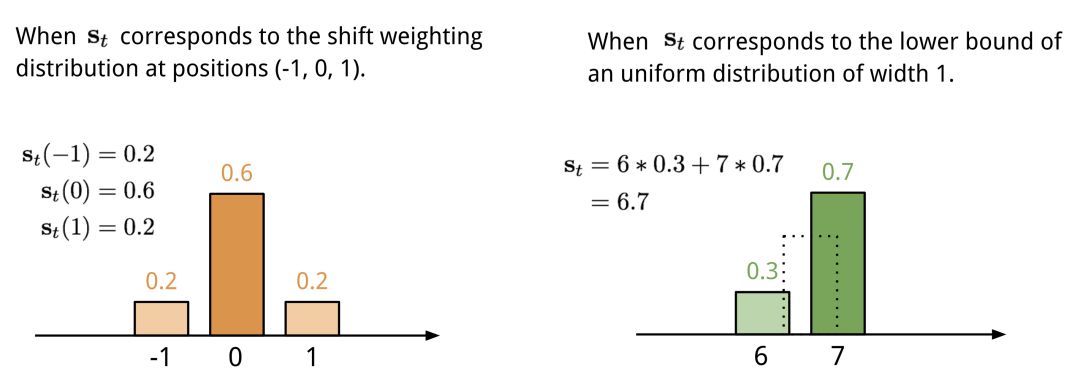 基于位置的寻址将注意向量中不同位置的值相加,并通过允许的整数移位上的加权分布进行加权。它等价于与核函数st(.)的一维卷积,st(.)是位置偏移的函数。定义这个分布有多种方法。参见图11以获得启发。