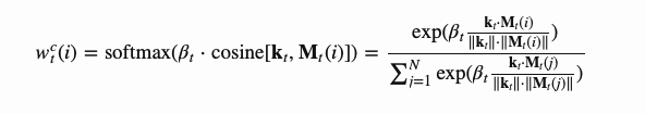 基于内容的寻址方式,就是根据控制器从输入行和内存行提取的关键向量kt之间的相似性来创建注意向量。基于内容的注意力机制用余弦相似度来计算相似性,然后用softmax函数进行归一化。此外,神经图灵机增加了放大器βt用来放大或衰减分布的重点。