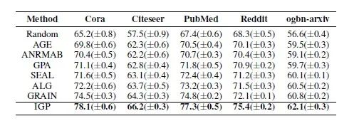 数据集使用了 3 个论文引用数据集:Cora、Citseer 和 PubMed。一个社区数据集 Reddit。一个 OGB 公开数据集 ogbn-arxiv,具体细节信息如表格所示。而对比的 baseline 里我们选择了 GRAIN [4] 和 ALG [5] 等最新的在图上做主动学习的方法。