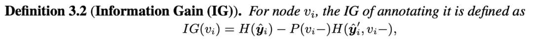 对于 k 层 GNN,一个节点的监督信号可以传播到其 k 跳邻域节点,然后影响这些邻域的标签分布。因此,在节点选择过程中只考虑节点自身的信息增益是不合适的。于是我们扩展了图 3 中定义的单个节点的信息增益到图中它的 k-hop 邻居,具体公式如下: