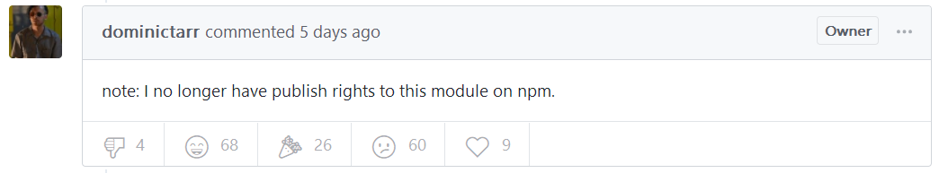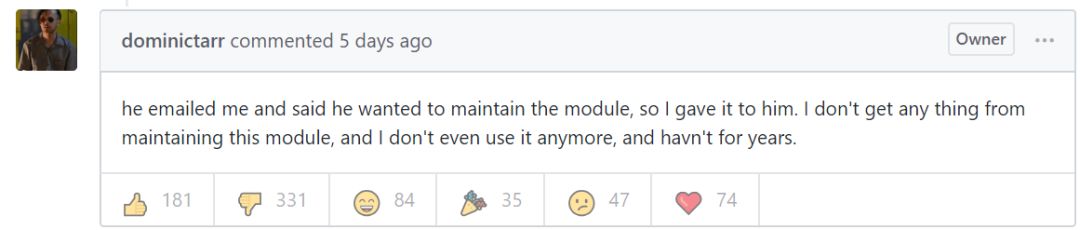 然而不怕神一般的对手,就怕“小猪佩奇”一样的队友。数月前,在 GitHub 上这个库的维护者@dominictarr 因为缺乏时间和兴趣无法继续维护这个库了,于是就将该库转让给了一个完全不认识却又想要维护的陌生人@right9ctrl ,接而不少开发者的噩梦就此开始了。