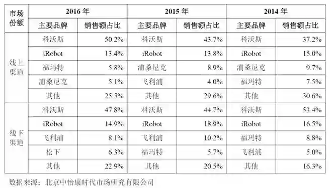 2014年起,家庭服务机器人业务逐步替代此前以代工产品为主的清洁类小家电业务,成为科沃斯的主要收入来源。无论是在线上线下渠道,科沃斯都占据了主导。中怡康数据显示,2016年,科沃斯在国内线上、线下渠道的销售额占比高达50.2%、47.8%。