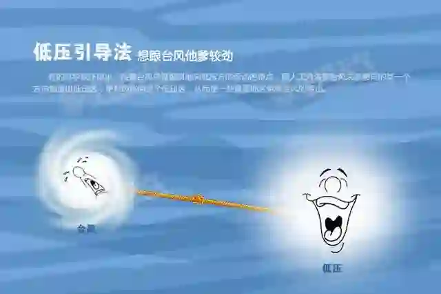 有的科学家还提出了引导法。根据台风总是偏斜地向低压方向运动的特点,用人工方法在台风未来移向的某一个方向制造出低压区,使台风移向这个低压区,从而使一些重要地区免受台风的袭击。用这种方法,还可以把台风引导到我们希望它去的地方,让它丰沛的降水造福人类。