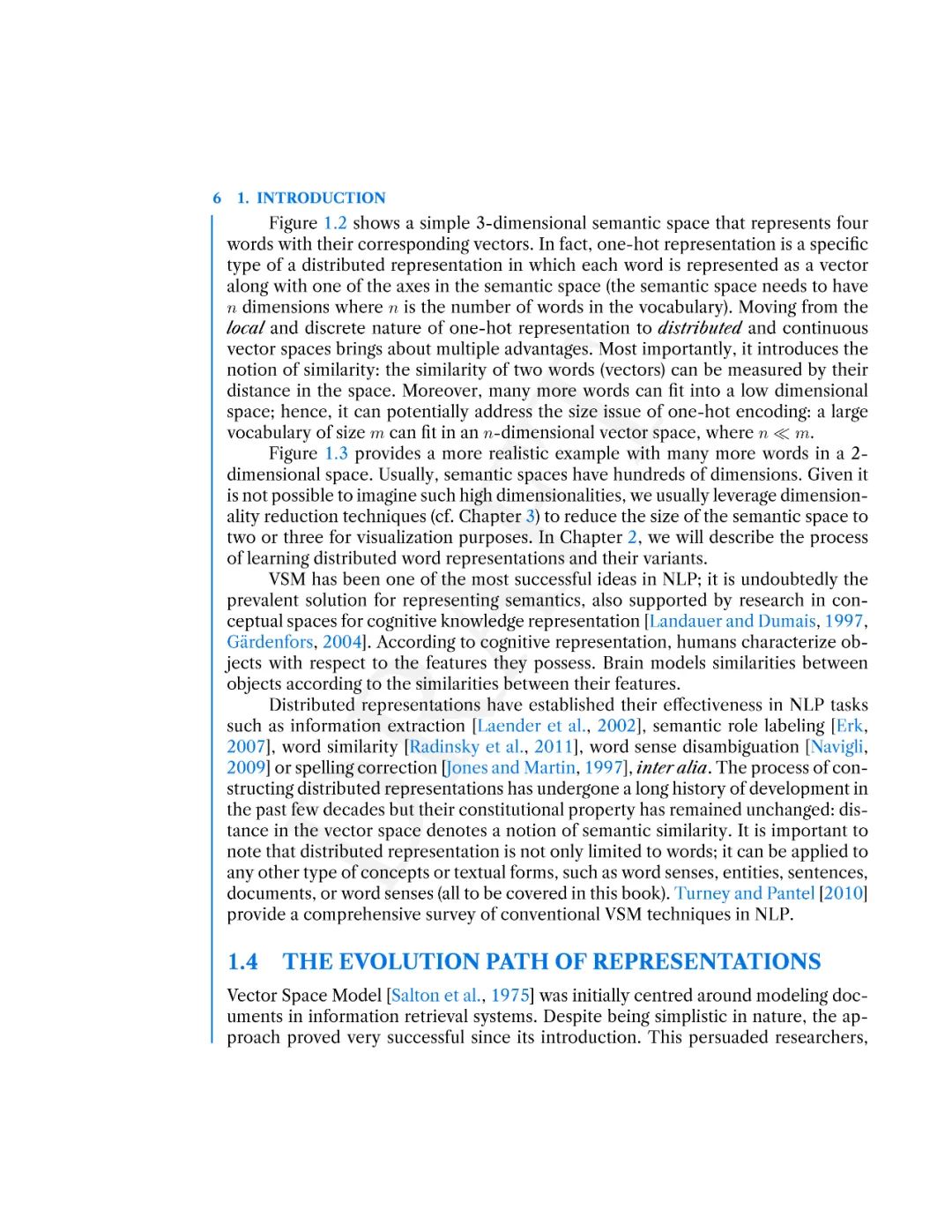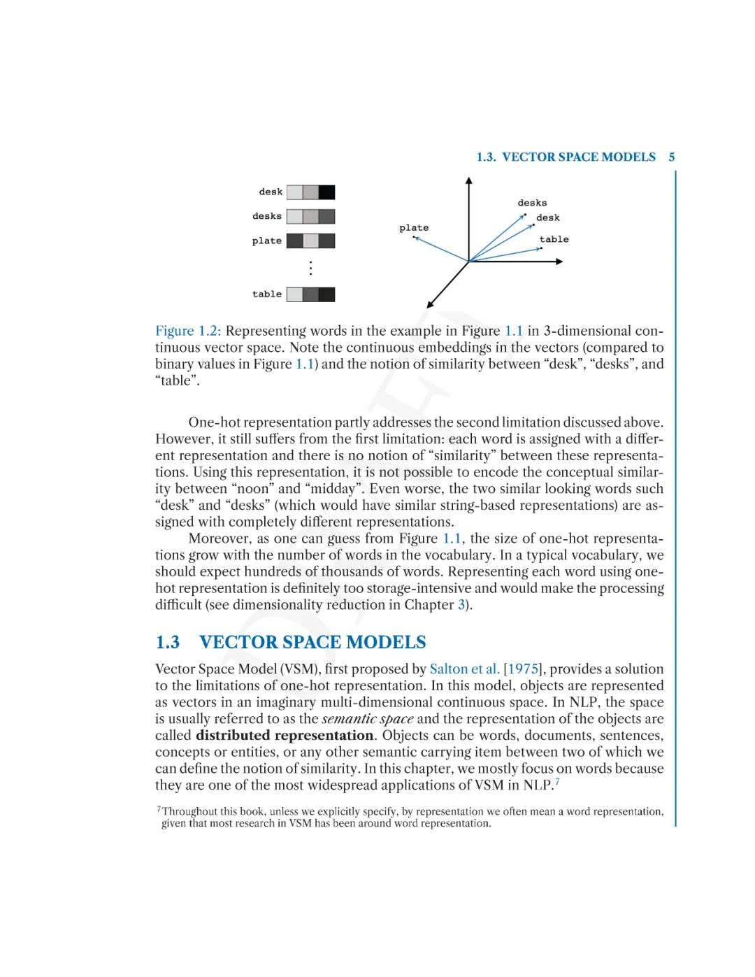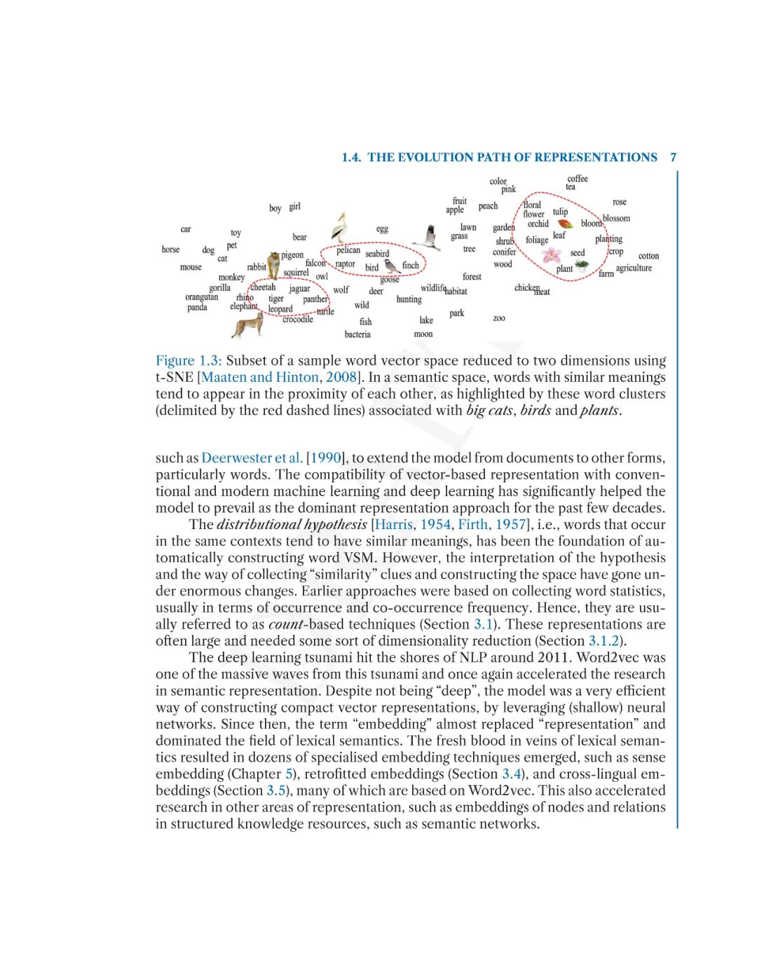 第3章讨论了单词表示,从传统的基于可数的模型的简要概述开始,接着是最近的基于预测的和基于字符的嵌入。在同一章中,我们还描述了一些专门用于嵌入的技术,例如跨语言单词嵌入,以及单词表示的通用评估方法。