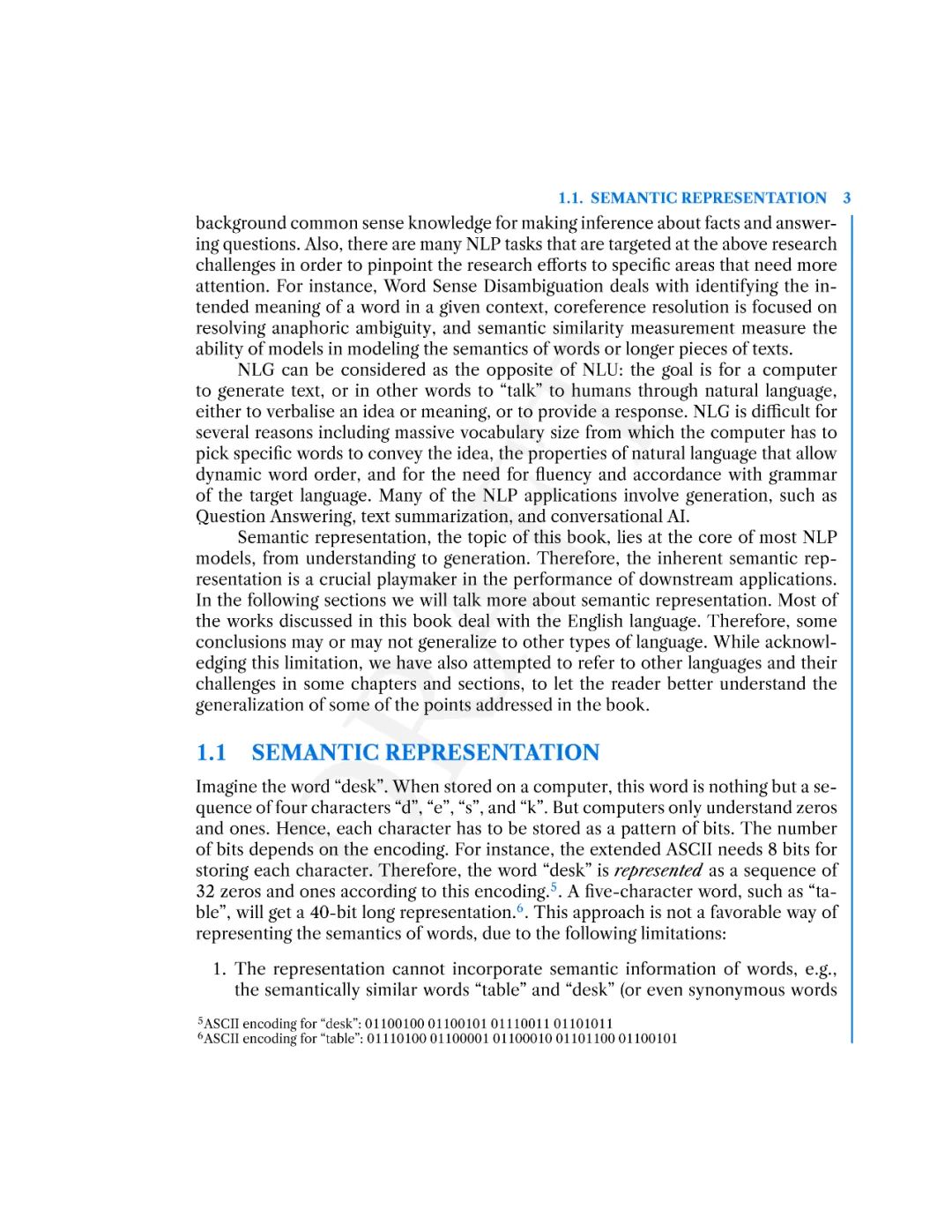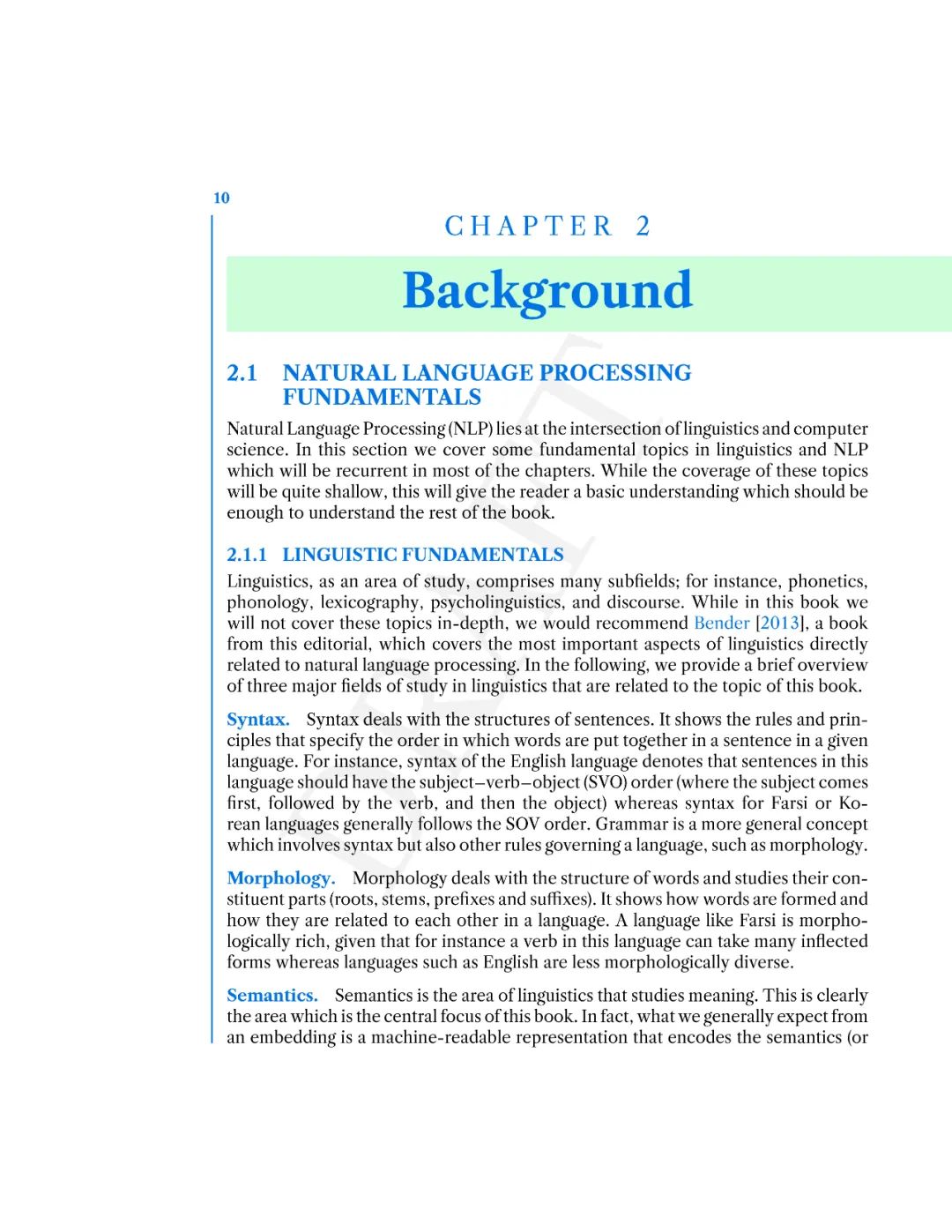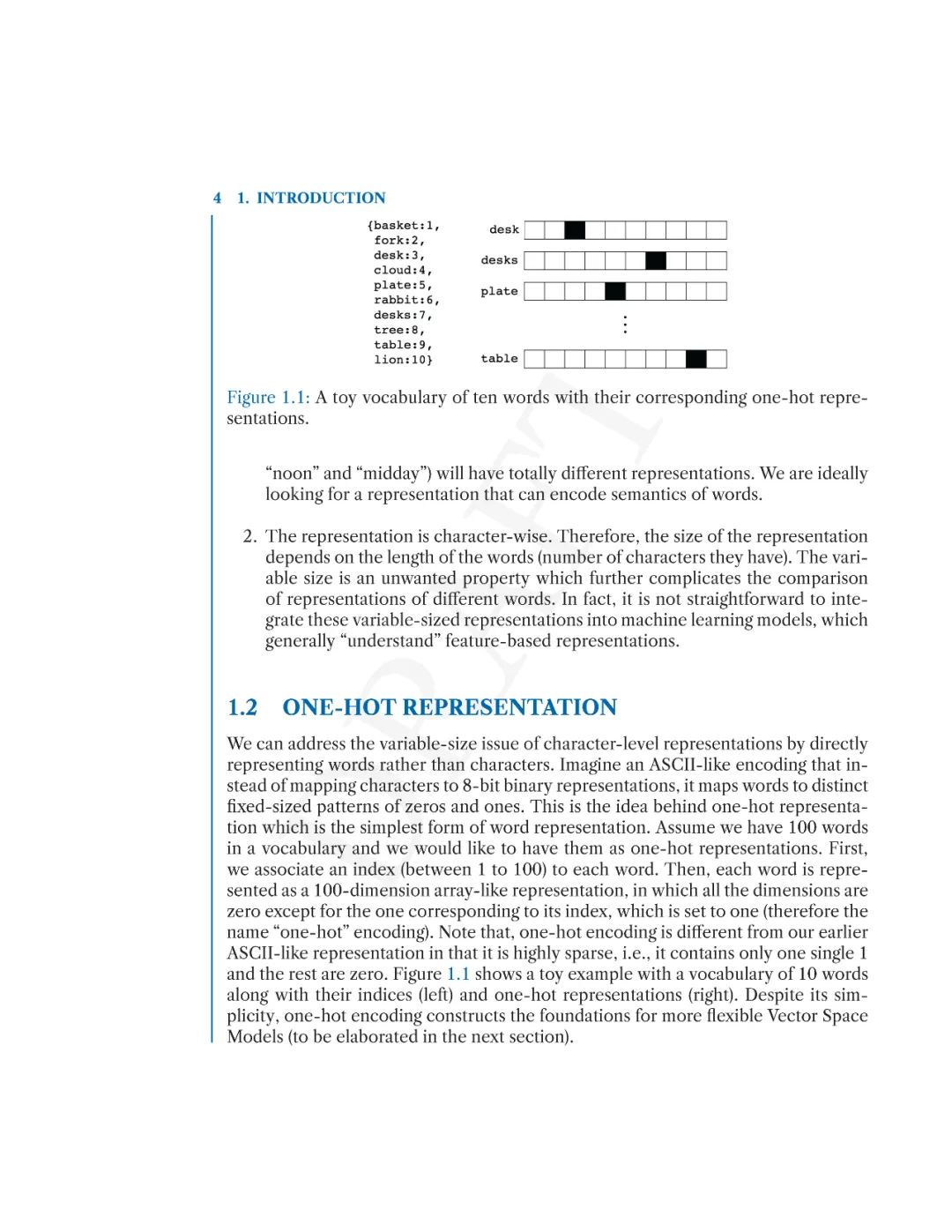 第3章讨论了单词表示,从传统的基于可数的模型的简要概述开始,接着是最近的基于预测的和基于字符的嵌入。在同一章中,我们还描述了一些专门用于嵌入的技术,例如跨语言单词嵌入,以及单词表示的通用评估方法。