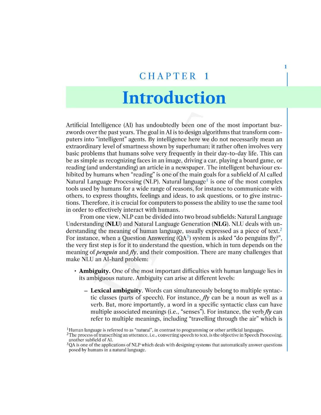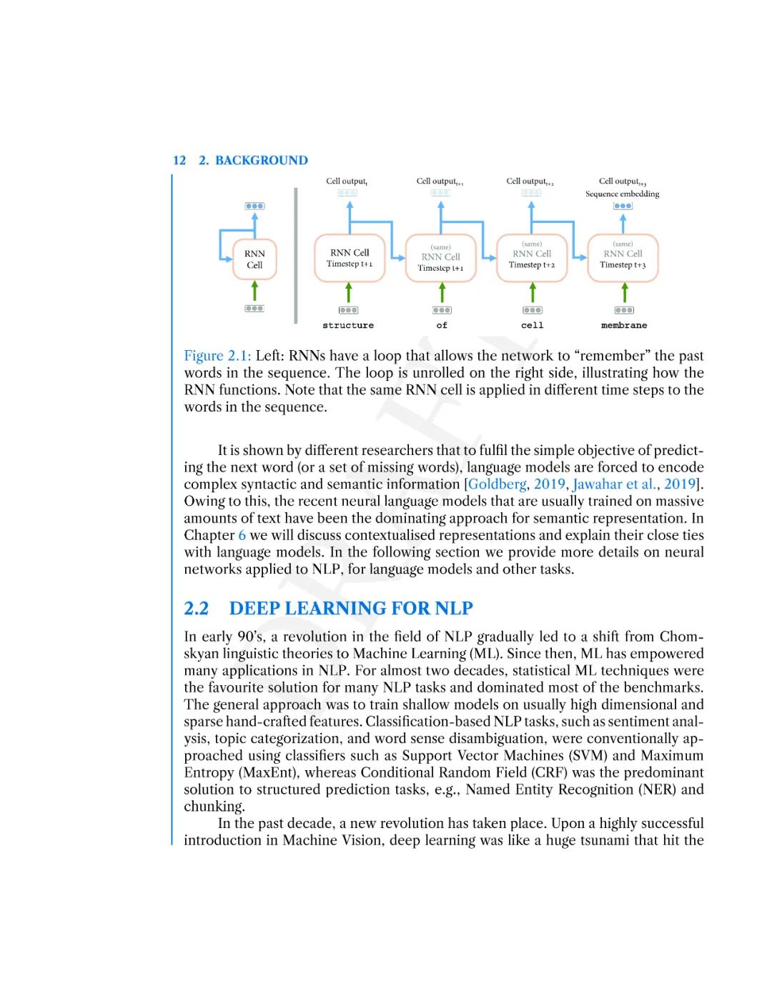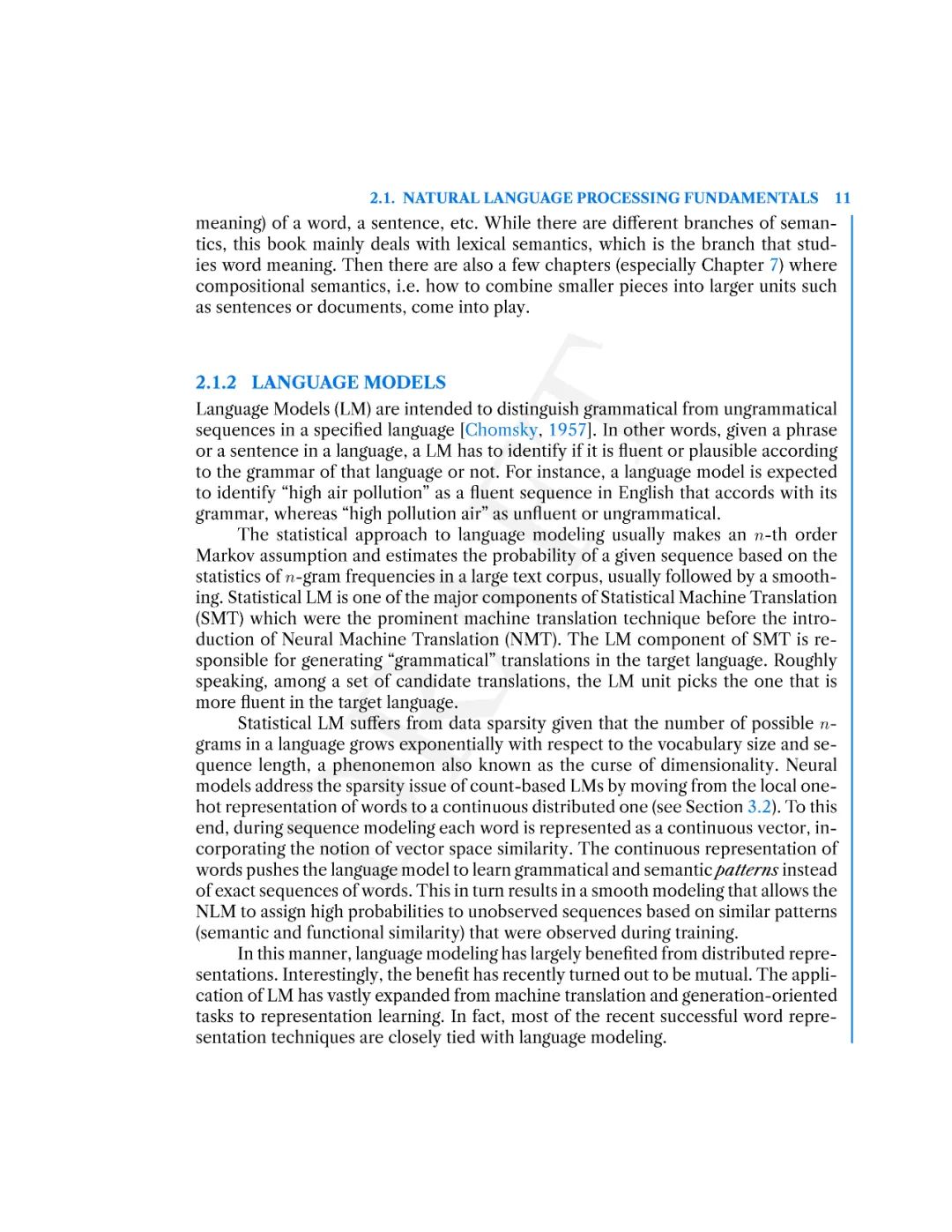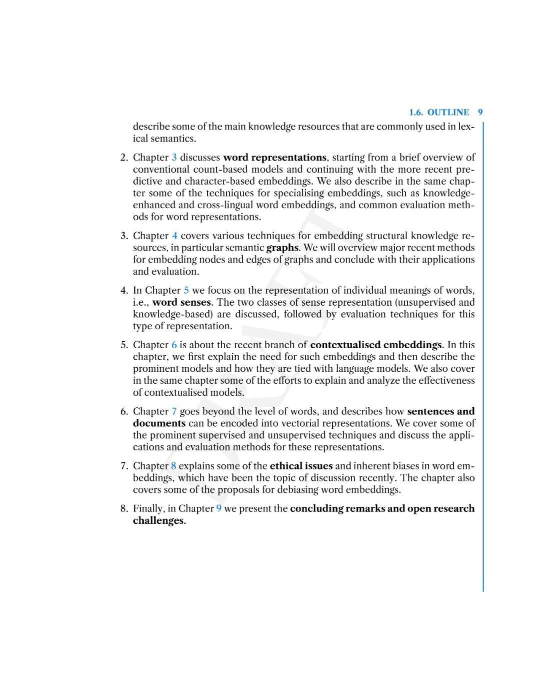 第六章是关于上下文嵌入的最新分支。在本章中,我们首先解释这种嵌入的必要性,然后描述主要的模型以及它们如何与语言模型相联系。在同一章中,我们还介绍了解释和分析上下文模型有效性的一些工作。