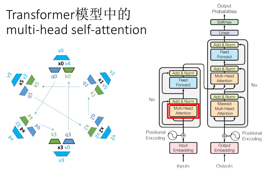 假设一句话中有六个词,分别被称为X0,X1...X5。self attention需要在这六个词语之间建立联系,首先,每个词语将通过线性映射被映射为一个我们称为key 和value的向量,每一个query需要和其他key进行向量点积,其点积结果就可以被看作相关度,最终我们可以得到每个词语和其他哪个词语更为相关。