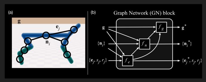 例如我们将机械狗作为一个物理上的多体框架放在图网络上进行处理,首先,图网络可以将机械狗的每个机械结构作为一个实体,机械结构之间由关节相连,关节就可以被看做连边,而节点和连边之上都是带有信息的,这样我们就获得了一份图网络数据。每个节点上都可以有一组向量,而机械狗的运动就可以由所有的节点向量和连边向量来表示。当然,我们也可以加入更多的全局信息,例如从宏观状态上观察到的机械狗的运动信息等等。