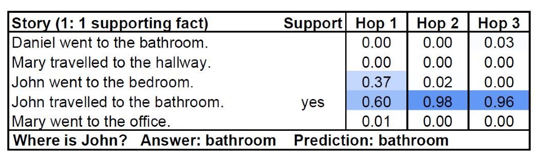 在上图中:Attention机制在不同的循环步数中关注到了John的动作和位置信息,从而给出了正确答案。