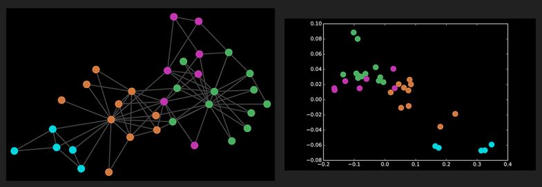 对图网络进行卷积之后,我们很意外的发现,图网络竟然在完全随机化的初始条件下,完成了在表征空间下的标签聚类。实际上,这正是因为图卷积操作就是在捕获图网络上的邻域信息,而邻域信息也被包含于节点和连边的数值中。在经过非线性映射之后,我们可以将其理解为对各种特征进行强化和分散处理,使特征更为明显,从而更好地完成聚类。
