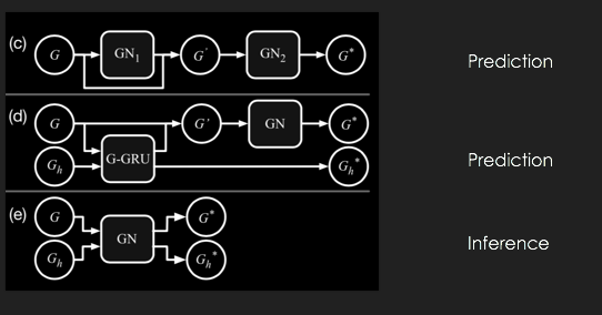 怎样进行更高层的信息整合呢?在基本的图网络构建完成之后,我们可以在高层次对信息进行处理来完成更复杂的任务。例如,我们可以将多个图网络叠加在一起(每一个图网络都是同构的,但它们表征的信息并不同),这样我们就可以构建出多层的图网络,从而拟合复杂的运算过程。我们也可以将不同时间的图网络状态放入RNN架构中,从而完成对网络状态的预测,甚至我们可以将网络的输出作为自己的输入,进行后续状态的预测和生成。