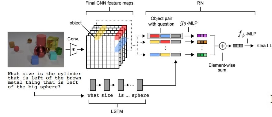 在这个问题中,我们可以让Relation Network去将任意两个Object两两组合,形成联结对,再与问题的编码相结合,通过线性映射形成对问题和答案的表示,最终再映射为对问题的解答。选择问题答案的时候,我们同样可以将每个答案和问题去拼接,通过是否有关的映射之后再映射为最终答案。