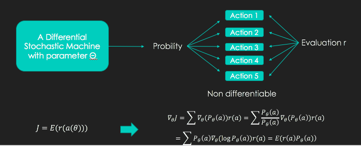 具体而言,现在的技术可以做到对不可微分领域的学习,这与传统的深度学习非常不同,我们不需要结构是可微分的,这就大大拓展了深度学习的可应用范围。怎样连接不可微的部分呢?我们可以通过Policy Gradient算法完成这样的连接。例如,我们有一个复杂的神经网络,在最后一步我们需要按照概率做一个选择,而概率选择会将梯度信息的中断。而Policy Gradient则可以通过概率期望替代评价函数,并非每次都获得回报,而是通过多次采样的期望收益进行反向传播。这就使得离散的选择变成了可传递梯度的架构。