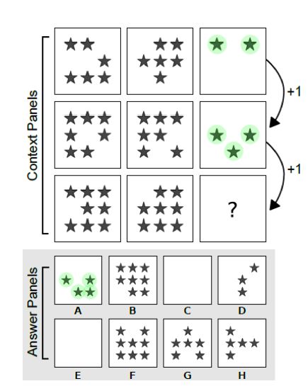 这个问题的做法是:从纵向来看,每一个方框都要比上一个方框中的五角星多一个,所以答案是A,可以看到,这个过程需要大量的关系推理,即使是人类完成这个问题也并不容易。