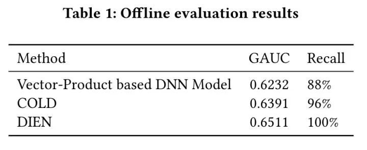 从 Table 3 可以看到,向量内积模型的系统性能最好,而精排的 DIEN 的系统性能最差,COLD 则在两者之间取得了平衡。