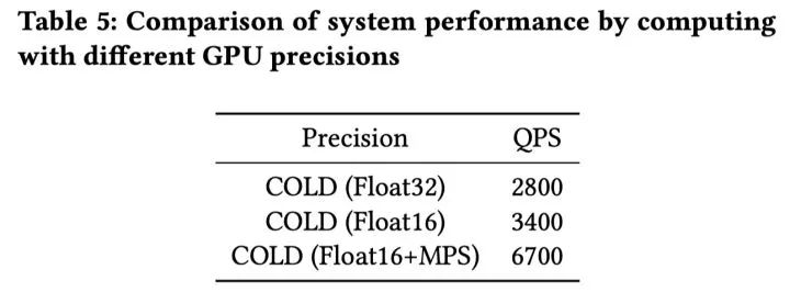Table 5 表明,工程优化上引入 Float16 和 MPS 优化以后,QPS 提升了 1 倍,效果显著。