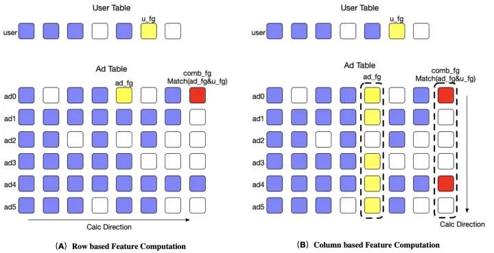 常规计算广告矩阵的方法是逐个广告计算在不同 feature group 下特征的结果,这个方法符合通常的计算习惯,组合特征实现也比较简单,但是这种计算方式是访存不连续的,有冗余遍历,查找的问题。