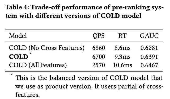 COLD 在得到特征重要性分数以后,会选出不同的候选特征,并基于离线指标进行特征选择。Table 4 列了几组供选择的特征,可以看到 COLD 是考虑效果和系统性能以后的折中。