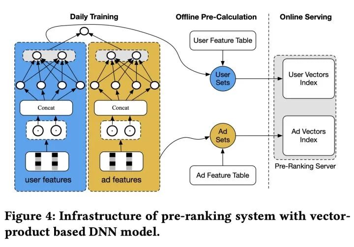 粗排在召回和精排之间,一般需要从上万个广告集合中选择出几百个符合后链路目标的候选广告,并送给后面的精排模块。粗排有很严格的时间要求,一般需要在 10~20ms 内完成打分。