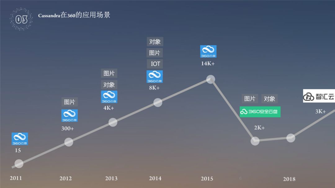 基于360云盘使用 Cassandra,云盘从15台机器一直到14000+台机器,应用场景主要是个人数据,自己产品中间的图片,内部视频对象等;在2015年,360云盘转型为企业云盘,机器数量就下降了,到2018年,智汇云又继续前行,目前机器差不多是3000左右的规模,以上是360的应用场景。