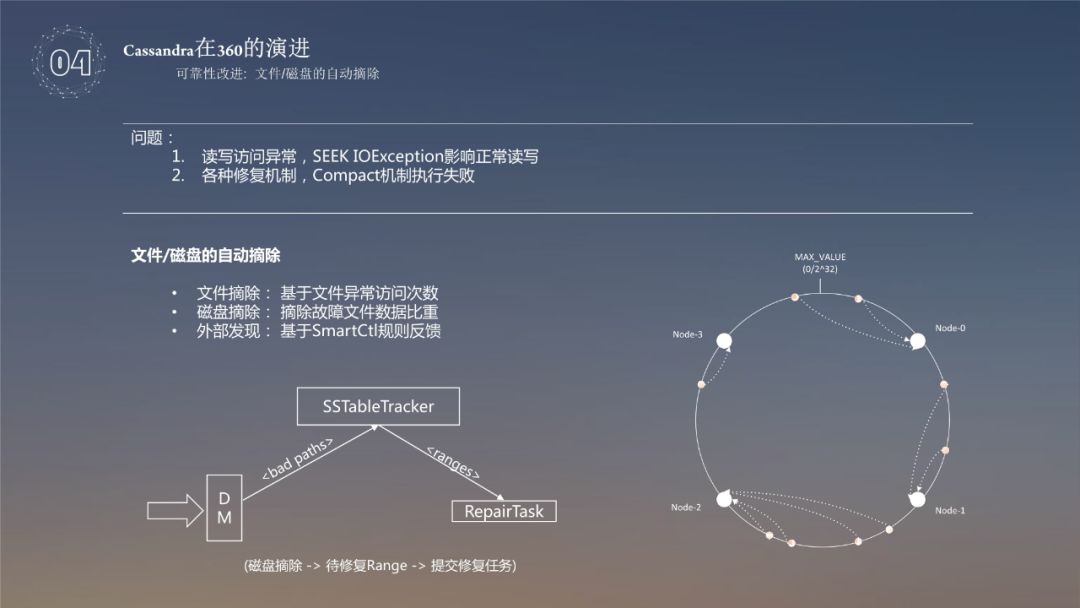 首先来说一下文件/磁盘的自动摘除, 存在的问题主要有两点,一点是读写异常,SEEKIOException 影响正常读写,另外一点是各种修复机制,Compact 机制执行失效,针对以上的两点问题,主要采用了基于文件异常访问次数的统计,摘除故障文件数据比重,外部发现基于 SmartCtl 规则反馈,将以上的问题反馈到系统中,就可以精确的知道哪块磁盘有哪些问题。