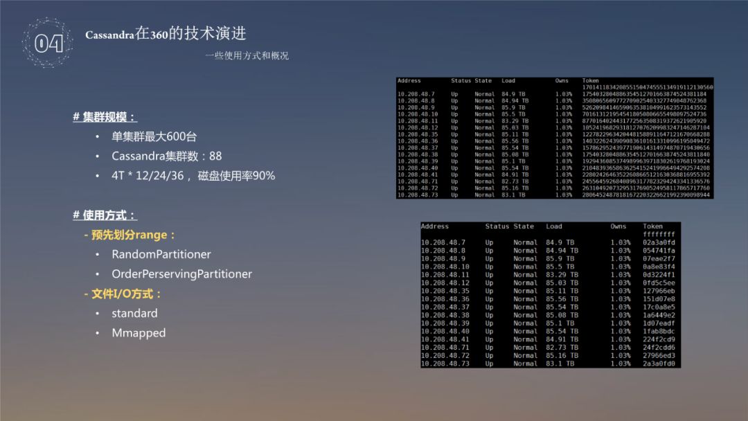 Cassandra 是一种无中心的系统,对于消息的广播,有一些规模的限制,基本单节点到600台的时候就差不多了,当时云盘的集群规模,单集群是600台,Cassandra 集群规模达到了88个,磁盘使用率达到了90%,主要是为了成本考虑,把磁盘使用率达到了90%。这其中用的是预先划分 range,毕竟当时没有 VNode,使用预先划分首先是使用 RandomPartitioner,使用例如 hash,md5 让数据随机打到环上,这个是使用最多的;还有一种是 OrdePerservingPartitinoer,这是一种保序的方式,把一些 key 保序的存在环上,文件 I/O 使用的 standard 跟 Mmapped,Mmapped 理论上是减少内存拷贝,对性能很好,但是如果数据量涨到80%到90%的时候,Linux 内核页表的开销占用量很大,所以最后放弃了 Mmapped 的方式,使用了 standard 的方式。