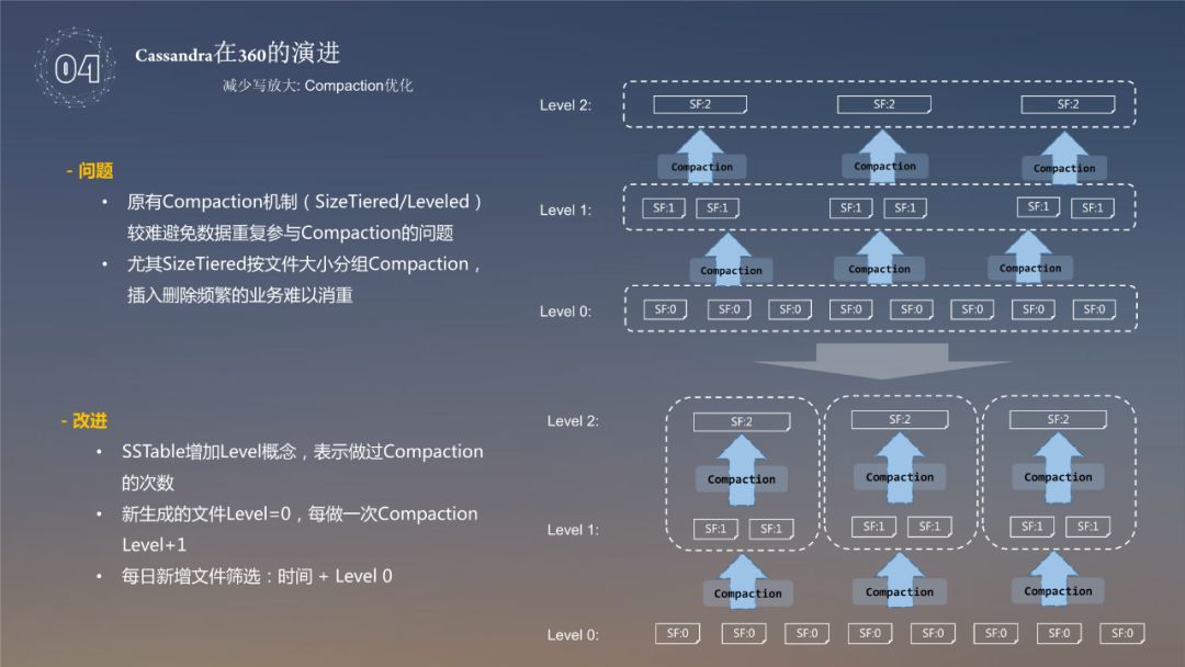 针对上述问题,我们采用给 SSTable 增加 level 概念。正常的是给每层的数据从 level 0 -> level 2,到 level 2 后,compaction 就不会参加,也就说最多做两次。360对于这一块做了如下的改进:让每层的 compaction 结合虚拟目录,在 level 0 做 compaction 的时候,分成各种各样的虚拟目录进行 subrange,subrange 里边再去做 compaction,这样的话,就相当于虚拟目录没有重复的数据出现,控制文件参与 compaction 的次数,通过这两种方式,使磁盘的利用率达到了90%左右。
