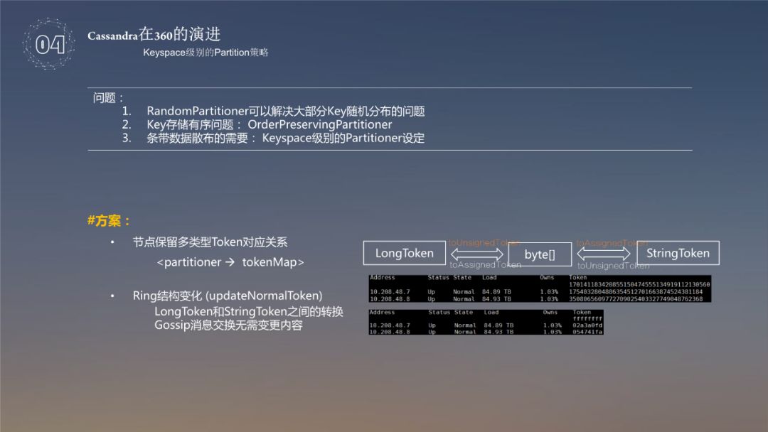 前面说 key 存储用到了 OrderPreservingPartitioner,这样在一套系统里需要两套不同的 partition 机制,如果进行数据交互,就需要既要保持 RandomPartition 的结构,还要保持 OrderPreservingPartitioner 的结构。这样的话,数据交换会变的异常的复杂,所以做了一个消息传递,过程中还是使用 LongToken 去存,在使用时,还是需要维护两套,当撤出或者加入环中时,都要进行转化,所以系统会看到两套内容。