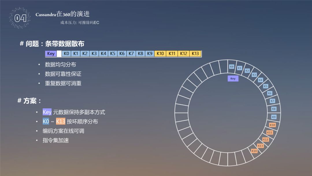 对于这个内容,EC 是把原有的数据进行块切分,算出校验块,然后校验块打散到整个集群中,如果丢失了几个块,可以用其他的10个块进行修复,再把分散的块 key 存储到 cfindex 的表中。对于前边的条带方式,主要使用切分 value,value 采用的是 512k 切成等份的4等份,可以得到4个校验块,需要全部打散到不同的数据块上,比如下图中的 k13,k14 不能放到一台机器上,这样才有意义,一旦数据丢失了,还可以方便恢复,如果四个块在一台机器上,坏了两台机器就没法恢复了,key 的数据有两部分,一个是元数据,一个是条带数据。元数据还是保持多副本的形式,但是算出来的条带数据实际上是按环分布,分成单副本的方式去存储,这样其实就可以达到三副本到1.4副本,编码可以在线调整,还可以使用指令集加速,通过指令集对 EC 进行加速,这块比较难的问题是如何把 Key 值分散在整个环上,而且还在不同的机器上,如果使用 Md5 算出来 value 值当作 key 值,还是有可能 Key 值存储在一台机器上,所以还是采用了 OrderPreservingPartitioner 保序的方式去存储。