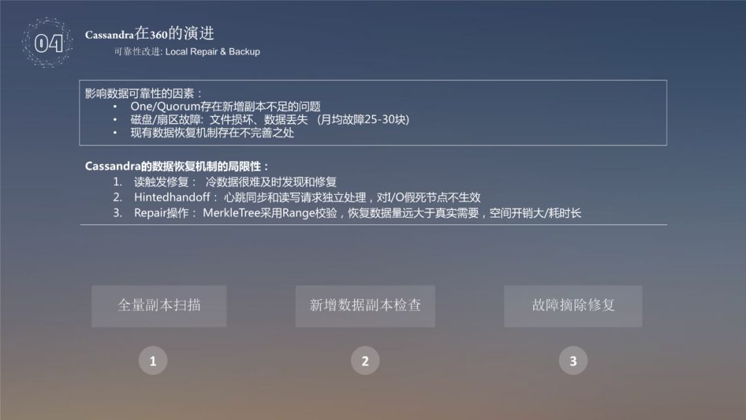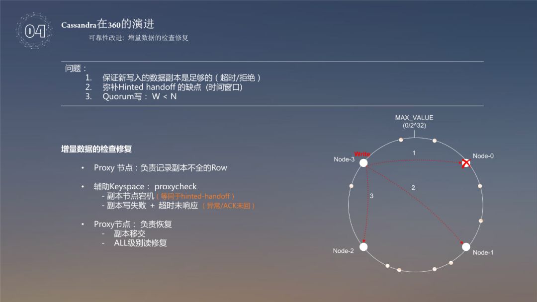 因素 ❶ 是第三副本是否可以成功写入的问题,使用非 ALL 策略写入 Cassandra 时,只要满足写入策略即返回成功,例如 quorum 级别写入3副本数据,当两个节点写入成功即返回写入成功,虽然原始设计为了保障第三副本写入成功使用 hintedhandoff 机制来保证,但程序设计最多能支撑3小时的时间,虽然该项可配但也受限于接入节点的存储容量,因此360针对此问题做了优化,研发 proxycheck 功能将未成功写入打散到全集群,当故障节点恢复时,基于 proxycheck 会修复残缺副本;