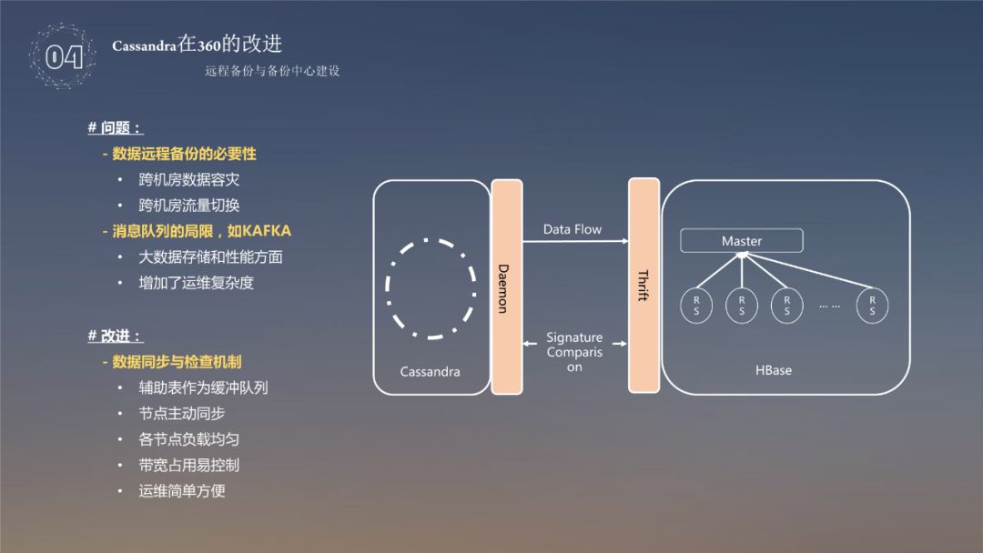 数据的恢复,涉及到存储,同时,还需要用到数据的备份。当时没有所谓的多 DC 方式,都是自研的备份系统,当时 Cassandra 的集群数量有88个,如果采用 Cassandra+Cassandra 的主备模式,那将又是88个集群,这是对运维和成本的巨大挑战;因此我们选择了在极大规模场景下扩展更好的 HBase 作为备份存储,使用 Cassandra ( 主 ) +HBase ( 备 ) 方案,这样全球88个集群数据备份集中至四大备份中心。大量的数据备份,经常使用的方式就是消息队列,数据的汇聚会增加运维的成本以及数据的落地然后再去做,这样操作的话,延时会比较高。所以在 Cassandra 中做了一个机制,每个节点负责自己的 range 管理,可以记录到自己的缓存表中,从缓冲表取出来备份到数据中心,使用 Thirft 接口,HBase 跟 Cassandra 的接口完全是兼容的,这样设计 HBase 备份中心就相当于一个 Cassandra 的数据中心了,如果数据大量丢失,或者数据出现大量的错误问题,可以直接无缝切换到 HBase 上提供服务,然后再使用 HBase 备份的数据慢慢恢复丢失的数据,用户完全不会感觉到服务异常,提高了用户的体验。