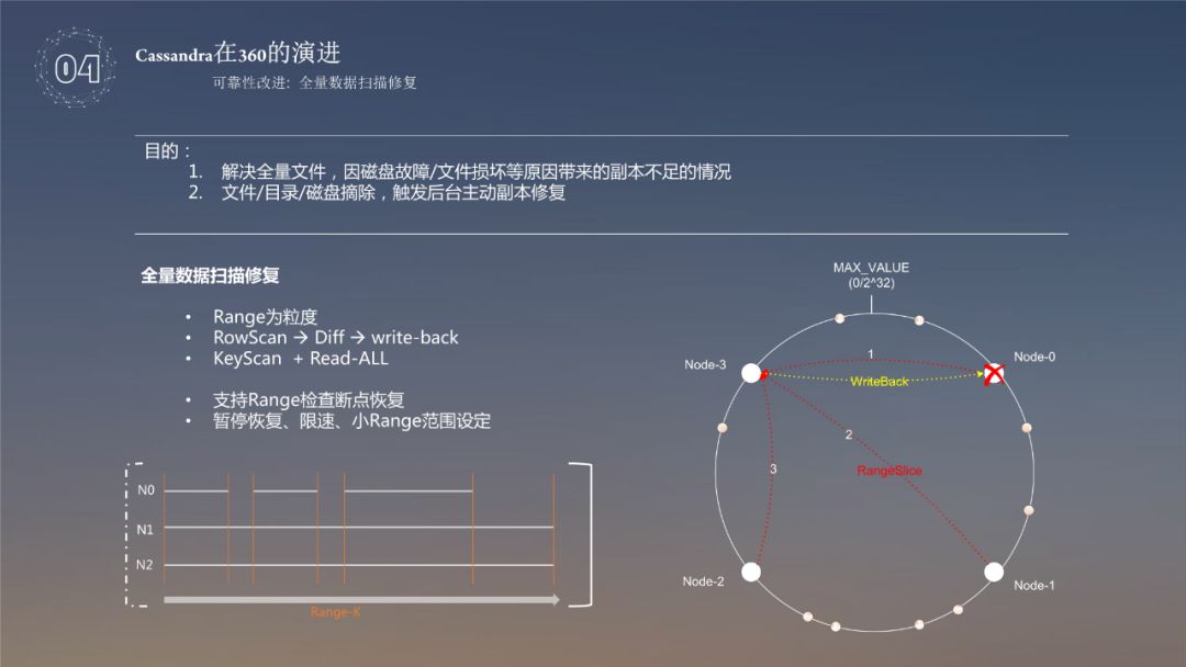 修复磁盘故障摘除,此处针对的是全量数据的磁盘故障摘除,使用全盘数据扫描恢复的目的主要有两点,一是用来解决全量文件,因磁盘故障/文件损坏等原因带来的副本不足的情况,二是文件/目录/磁盘摘除,触发后台主动副本修复。全盘数据扫描修复,从 Range 的开始,三个节点都读数据,如果数据存在冲突,就使用另外两个节点去解决数据冲突,最后把数据恢复。每个节点都会附一个 range,range 的主要作用就是从三个节点上把数据取过来进行比对,然后把解决冲突的数据恢复掉,另外一种方式使用 KeyScan+Read-All,使用 KeyScan 拿到的是一些 key,对于大量的插入,像云盘用户是大量的插入比较多,删除的操作很少,这种场景下数据存储使用的是 key-value 的数据格式存储,这种情况下,如果节点上丢掉了哪些数据,可以直接使用 key 来修复这些丢掉的数据。通过这两种方式可以解决文件丢失或者损坏的问题。